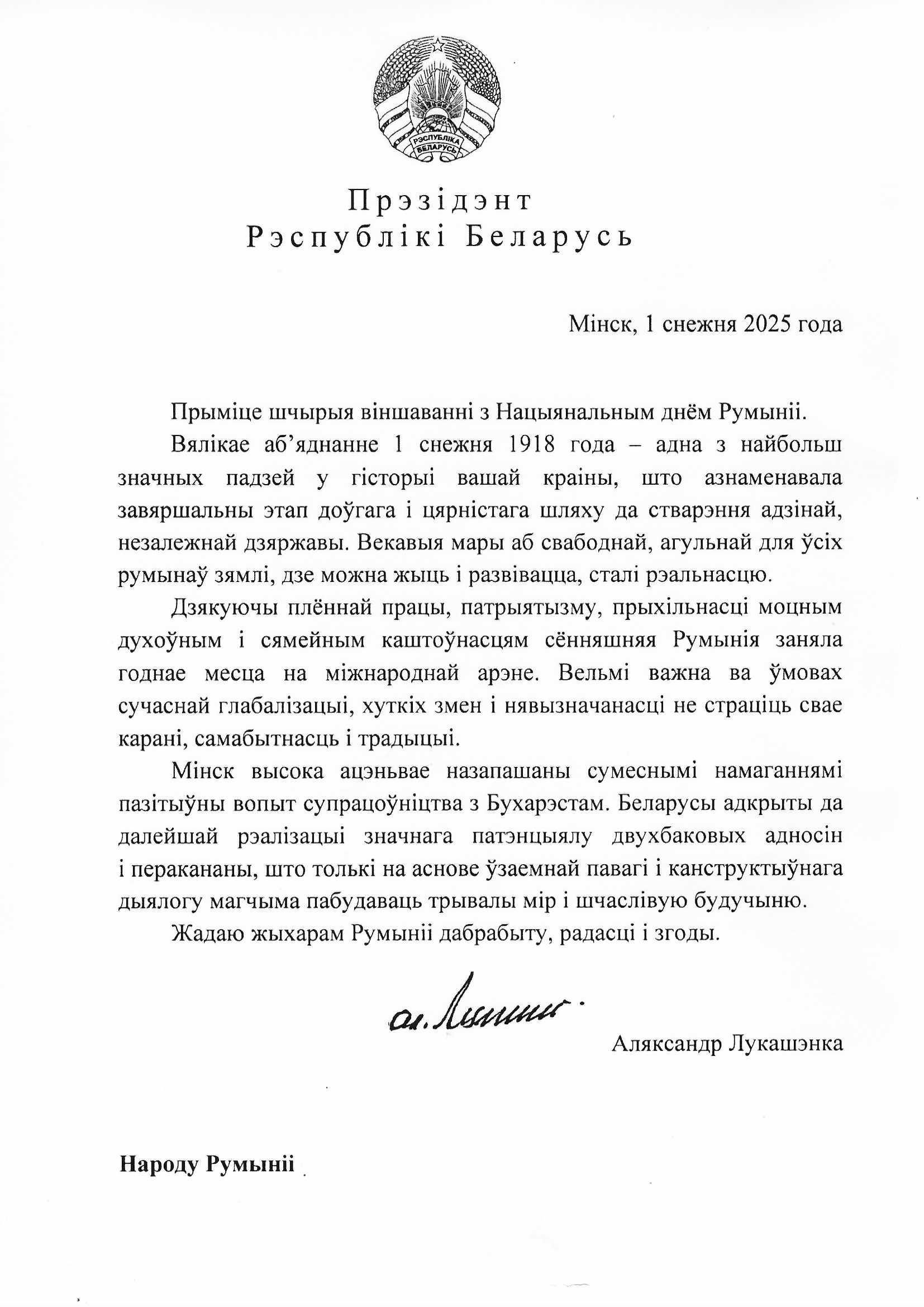 Mesajul de felicitare adresat Poporului Român de către Președintele A.Lukașenko cu ocazia Zilei Naționale a României